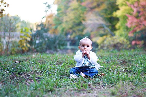 Beautiful pictures as always! I really do LOVE the fall here in Richmond. I have a random question for you. Camdyn is at the stage where she gets bored easily because she isn't crawling yet. When I try to sit her down, she gets stiff because she wants to be standing. So my question is...Did Sadie use that exersaucer very often? I am thinking she would like it, but I just didn't know if it would be one of those things she would only use for a little while and then I would regret ever buying it. I just have no idea because Teegan never used one when he was a baby. Any advice in this department would be great. Thanks for your help Ashley!