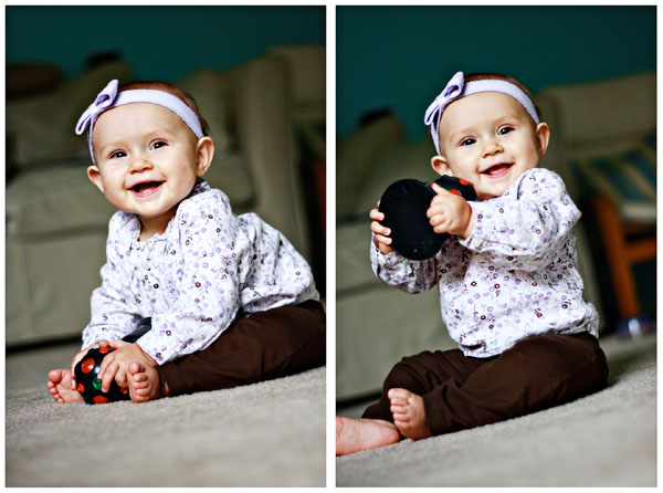 Wow...almost walking?! Good luck with that. I LOVE those rolly-polly legs! They look like Camdyns. Your pictures look awesome! I'm sure Sadie will appreciate them when she is older. I love the one of you & her together...so cute! As for the ball of fun, we need to get one of those. Family dance parties are out fav!!
