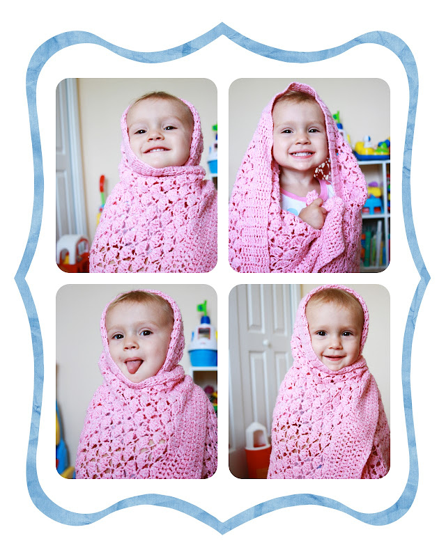 A couple of weeks ago I put this blanket around Sadie and I told her she looked so cute, like a little angel. So for the next hour and through out the day Sadie kept saying, "angel, angel" and tried to wrap the blanket around her. She kept giving me these little posing faces. I guess she knows how cute she is.